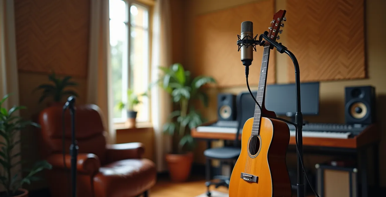 For the home-recording musician, capturing the true sound of an acoustic instrument is the ultimate challenge. You invest in a quality microphone, place it in front of your guitar, and the playback reveals a sound that is disappointingly “boxy,” thin, or clouded in a small-room echo. This frustrating gap between the instrument’s rich, in-person tone and its recorded counterpart is a universal problem. The common advice is to buy an even more expensive microphone or cover your walls in thin foam squares, yet these solutions rarely address the root cause.